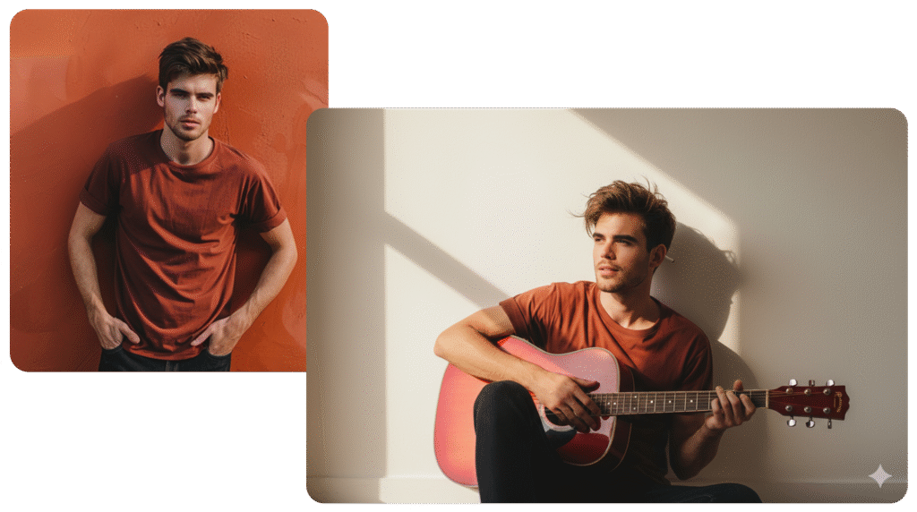 Using Image 1 (the garment) and Image 2 (the model), create a hyper-realistic full-body fashion photo where the model is wearing the garment. Crucial Fit Details : The [T-shirt/Jacket] must drape naturally on the model’s body, conforming to their posture and creating realistic folds and wrinkles . High-Fidelity Preservation : Preserve the original fabric texture, color, and any logos from Image 1 with extreme accuracy. Seamless Integration : Blend the garment into Image 2 by perfectly matching the ambient lighting, color temperature, and shadow direction . Photography Style : Clean e-commerce lookbook, shot on a Canon EOS R5 with a 50mm f/1.8 lens for a natural, professional look.
