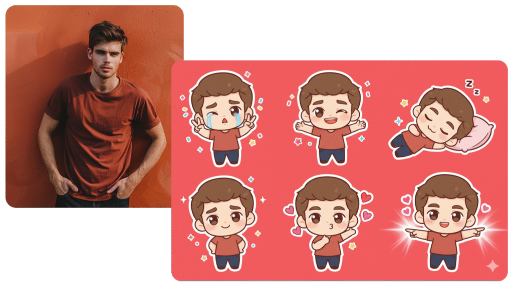 Making a playful peace sign with both hands and winking. Tearful eyes and slightly trembling lips, showing a cute crying expression. Arms wide open in a warm, enthusiastic hug pose. Lying on their side asleep, resting on a tiny pillow with a sweet smile. Pointing forward with confidence, surrounded by shining visual effects. Blowing a kiss, with heart symbols floating around. Maintain the chibi aesthetic. Exaggerated, expressive big eyes. Soft facial lines. Background: Vibrant red with star or colorful confetti elements for decoration. Leave some clean white space around each sticker. Aspect ratio: 9:16