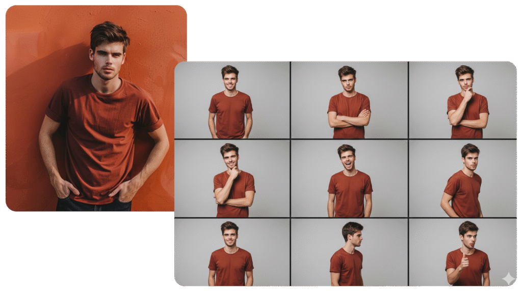 Turn the photo into a 3×3 grid of photo strips with different studio-style poses and expressions.