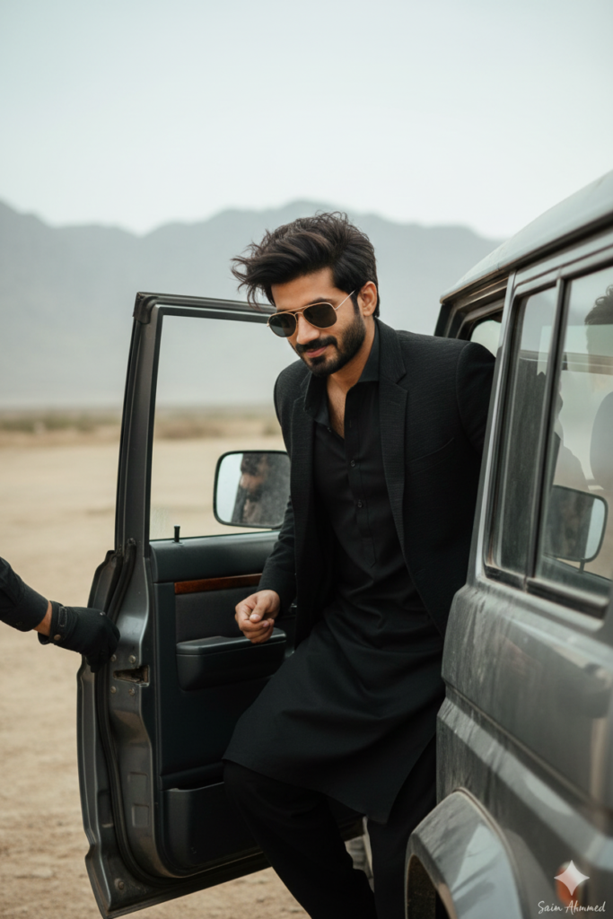 A CLOSE-UP, CINEMATIC SHOT OF 17 YEARS OLD YOUNG MAN STEPPING OUT OF A VINTAGE, DARK-COLORED OFF-ROAD VEHICLE (LIKELY A JEEP OR SUV) IN A DRY, DUSTY, AND ARID LANDSCAPE, POSSIBLY A DESERT OR REMOTE MOUNTAIN REGION. DETAILS: SUBJECT: A HANDSOME, 17 YEARS OLD YOUNG MAN WITH STYLED, DARK WINDSWEPT HAIR. HE IS WEARING STYLISH AVIATOR SUNGLASSES WITH GOLD FRAMES AND DARK LENSES, AND AN ALL-BLACK OUTFIT, CONSISTING OF A BLACK PATHANI-STYLE KURTA OR SHIRT AND A BLACK JACKET/ COAT DRAPED OVER HIS SHOULDERS OR WORN OPEN. HE HAS A SUBTLE, CONFIDENT, AND SLIGHT SMIRK ON HIS FACE, LOOKING DOWNWARDS OR SLIGHTLY TO THE SIDE. SETTING: A DESOLATE, OUTDOOR LOCATION WITH A DIRT GROUND AND HAZY MOUNTAINS OR HILLS IN THE BACKGROUND. THE SKY IS OVERCAST OR PALE. ACTION: THE MAN IS EMERGING FROM THE BACK SEAT OF THE VEHICLE: THE DOOR IS WIDE OPEN, WITH A NOTICEABLE DARK TRIM AND LARGE, CLEAR WINDOW. A HAND (POSSIBLY A BODYGUARD OR DRIVER) IS VISIBLE IN THE LOWER LEFT, REACHING TOWARDS THE DOOR. MOOD/STYLE: HIGH-CONTRAST, GRITTY, CINEMATIC STILL, EVOCATIVE OF A BOLLYWOOD ACTION FILM OR A SUSPENSEFUL THRILLER, WITH A FOCUS ON SHARP DETAIL AND THE CHARACTER'S AUTHORITATIVE PRESENCE. FACE 100% MATCH AS REFERENCE IMAGEÂ