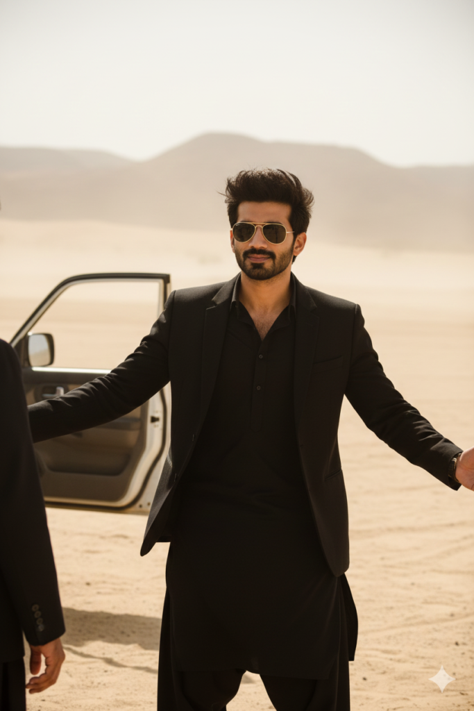 CREATE A REALISTIC THIS PICTURE SUBJECT: A 17 YEARS OLD YOUNG MAN, APPEARING TO BE AN ACTOR, WITH DARK, WINDSWEPT HAIR AND WEARING STYLISH SUNGLASSES WITH GOLD FRAMES (AVIATOR STYLE). HE IS DRESSED ENTIRELY IN BLACK: A BLACK PATHANI SUIT WITH A BLACK BLAZER, EXUDING A SHARP, PERHAPS VILLAINOUS OR SUAVE PERSONA. ACTION/EXPRESSION: THE MAN IS SMILING OR SMIRKING SUBTLY, WITH HIS ARMS OUTSTRETCHED AND PALMS SLIGHTLY OPEN IN A GESTURE OF PRESENTING, SHRUGGING, OR PERHAPS MILD EXASPERATION OR CONFIDENCE. HE SEEMS TO BE MID-CONVERSATION WITH SOMEONE PARTIALLY VISIBLE TO THE LEFT (ONLY AN ARM AND SHOULDER ARE SEEN). SETTING/BACKGROUND: THE SCENE IS SET IN A VAST, OPEN, AND DESOLATE LANDSCAPE THAT APPEARS TO BE A SANDY PLAIN OR DESERT, LIKELY DUSTY. THE BACKGROUND CONSISTS OF HAZY, LIGHT BROWN/TAN SAND AND SUBTLE PROPS/CONTEXT: A PORTION OF A VINTAGE OR OLDER MODEL WHITE VEHICLE HILLS IN THE DISTANCE, SUGGESTING A DRY, ARID ENVIRONMENT. (POSSIBLY AN SUV OR TRUCK) IS VISIBLE TO THE MAN'S LEFT, WITH THE REAR PASSENGER DOOR OPEN. THE ENVIRONMENT SUGGESTS AN ACTION OR DRAMA SCENE. STYLE/MOOD: CINEMATIC, HIGH-DEFINITION FILM STILL, DRAMATIC LIGHTING (THOUGH THE ENVIRONMENT IS BRIGHT), ACTION/THRILLER GENRE MOOD. FACE 100% MATCH AS REFERENCE IMAGE