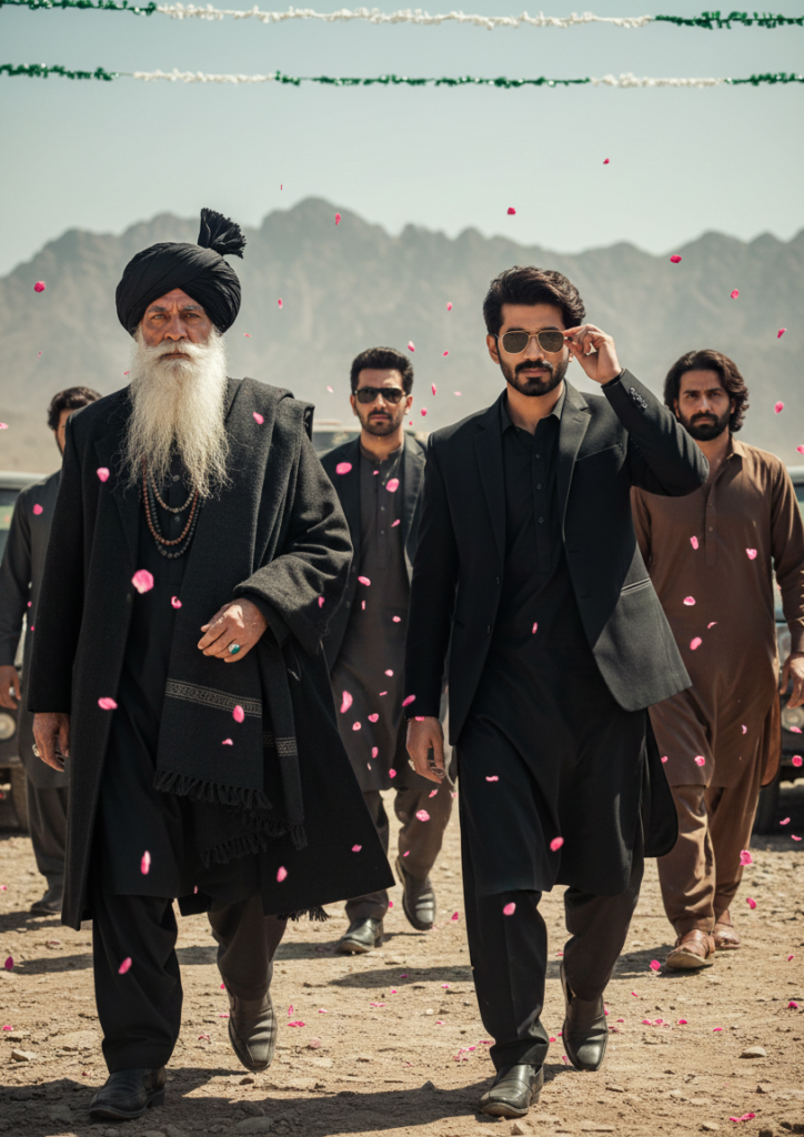 A WIDE, CINEMATIC SHOT FEATURING A GROUP OF MEN WALKING TOWARDS THE CAMERA IN AN OUTDOOR, ARID, OR DESERT-LIKE ENVIRONMENT. THE FOREGROUND FEATURES TWO PROMINENT FIGURES. ON THE LEFT IS AN OLDER MAN WITH A LONG WHITE BEARD AND A STERN EXPRESSION, WEARING TRADITIONAL ATTIRE INCLUDING A DARK TURBAN, A SHAWL, AND A HEAVY, DARK COAT OR ROBE. HE HAS DARK, BEADED NECKLACES AND A TEAL/BLUE RING. ON THE RIGHT, A 16 YEARS OLD YOUNGER, Signature : Saim Ahmmed STYLISH MAN WITH MESSY DARK WAVY HAIR IN A COMPLETELY BLACK SUIT AND PATHANI (OR SIMILAR) OUTFIT, WEARING QSUNGLASSES, IS ADJUSTING HIS GLASSES OR SHIELDING HIS EYES WITH HIS RIGHT HAND. BOTH MEN ARE WALKING WITH INTENT. IN THE BACKGROUND, THREE OTHER MEN FOLLOW: ONE IN THE CENTER WEARING A DARK JACKET AND SUNGLASSES WITH STUBBLE, AND TWO OTHERS ON THE PERIPHERY, ONE WITH LONG HAIR AND A BEARD WEARING A BROWN OUTFIT ON THE FAR RIGHT. THE ATMOSPHERE IS DRAMATIC, WITH PINK FLOWER PETALS (LIKE ROSE PETALS) FALLING OR BEING THROWN IN THE AIR AROUND THE MAIN SUBJECTS. THE SETTING APPEARS TO BE A DRY, MOUNTAINOUS AREA WITH DARK CARS VISIBLE BEHIND THE MEN, AND THIN GREEN AND WHITE DECORATIVE STREAMERS ARE STRUNG ACROSS THE TOP OF THE FRAME. THE LIGHTING IS BRIGHT AND HARSH, SUGGESTING AN OUTDOOR DAYTIME SCENE. FACE 100% MATCH AS REFERENCE IMAGEÂ