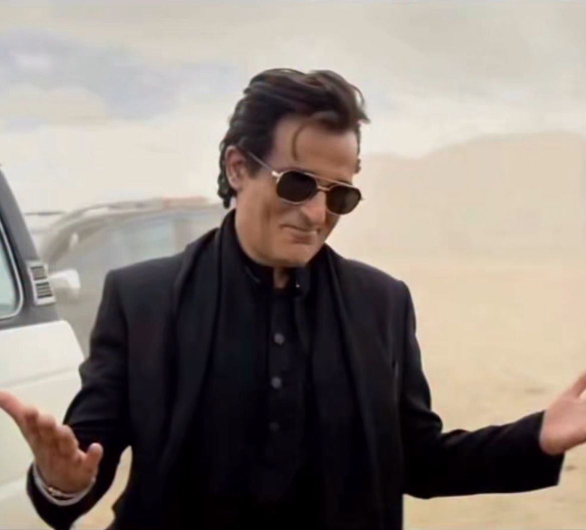 CREATE A REALISTIC THIS PICTURE SUBJECT: A 17 YEARS OLD YOUNG MAN, APPEARING TO BE AN ACTOR, WITH DARK, WINDSWEPT HAIR AND WEARING STYLISH SUNGLASSES WITH GOLD FRAMES (AVIATOR STYLE). HE IS DRESSED ENTIRELY IN BLACK: A BLACK PATHANI SUIT WITH A BLACK BLAZER, EXUDING A SHARP, PERHAPS VILLAINOUS OR SUAVE PERSONA. ACTION/EXPRESSION: THE MAN IS SMILING OR SMIRKING SUBTLY, WITH HIS ARMS OUTSTRETCHED AND PALMS SLIGHTLY OPEN IN A GESTURE OF PRESENTING, SHRUGGING, OR PERHAPS MILD EXASPERATION OR CONFIDENCE. HE SEEMS TO BE MID-CONVERSATION WITH SOMEONE PARTIALLY VISIBLE TO THE LEFT (ONLY AN ARM AND SHOULDER ARE SEEN). SETTING/BACKGROUND: THE SCENE IS SET IN A VAST, OPEN, AND DESOLATE LANDSCAPE THAT APPEARS TO BE A SANDY PLAIN OR DESERT, LIKELY DUSTY. THE BACKGROUND CONSISTS OF HAZY, LIGHT BROWN/TAN SAND AND SUBTLE PROPS/CONTEXT: A PORTION OF A VINTAGE OR OLDER MODEL WHITE VEHICLE HILLS IN THE DISTANCE, SUGGESTING A DRY, ARID ENVIRONMENT. (POSSIBLY AN SUV OR TRUCK) IS VISIBLE TO THE MAN'S LEFT, WITH THE REAR PASSENGER DOOR OPEN. THE ENVIRONMENT SUGGESTS AN ACTION OR DRAMA SCENE. STYLE/MOOD: CINEMATIC, HIGH-DEFINITION FILM STILL, DRAMATIC LIGHTING (THOUGH THE ENVIRONMENT IS BRIGHT), ACTION/THRILLER GENRE MOOD. FACE 100% MATCH AS REFERENCE IMAGE