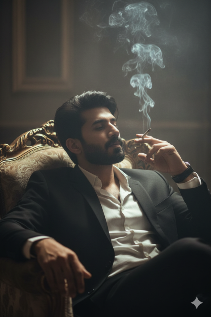 CINEMATIC NEO-NOIR PORTRAIT OF A MAN RECLINING IN A VELVET ARMCHAIR, ONE ARM DRAPED CASUALLY WHILE THE OTHER RAISES A CIGARETTE TO HIS LIPS. SMOKE CURLS INTO THE DIM, HAZY AIR, LIT BY SOFT, LOW-KEY CINEMATIC 1 LIGHTING THAT HIGHLIGHTS HIS PROFILE AND CHEEKBONE WARDROBE LOCKED: TAILORED BLACK SUIT, WHITE SHIRT SLIGHTLY UNBUTTONED, PROFESSIONAL YET CASUAL DOMINANCE, BACKGROUND LOCKED: VELVET CHAIR WITH ORNATE GOLDEN DETAILS, DARKENED INTERIOR FLLED WITH CINEMATIC HAZE. USE THE FACE FROM THE UPLOADED REFERENCE IMAGE AND PRESERVE THE SAME FACIAL FEATURES DO NOT ALTER THE FACE. MOOD: FEMME FATALE ELGANCE WITH QUIE MENACE, NOIR-DREAMLIKE ATMOSPHERE. FINAL RENDER IN ULTRA-DETAILED 8K CINEMATIC GRADE, SMOKY HIGHLIGHTS, DRAMATIC PAINTERLY CONTRAST.
