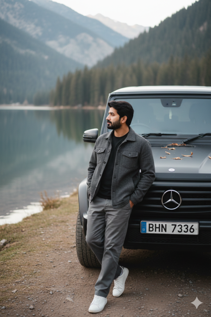 A casual, spontaneous candid of a young European man leaning against a matte black Mercedes-Benz G- Class SUV parked beside a tranquil mountain lake. He wears a lived-in dark-gray wool jacket over a black t-shirt, loose gray pants, and crisp white sneakers. The calm lake reflects pine-covered peaks blurred gently in the background, with natural ambient light casting delicate highlights on the jacket’s wool texture and the slightly worn SUV surface. The framing is at eye level with a relaxed, slightly off- center composition, capturing authentic skin texture, fabric grain, and subtle environmental shadows typical of an intimate iPhone snapshot. The overall mood is quietly contemplative, blending urban style and natural stillness in seamless spontaneous realism