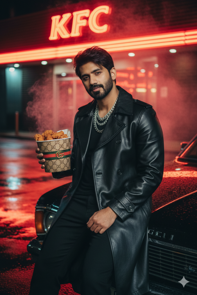 USe a reference image for character : in a black leather Gucci trench coat and silver chains sitting on the hood of a vintage car outside a glowing KFC restaurant at night, holding a Gucci-branded bucket of chicken like a champagne bottle, smoke, rain reflections on asphalt, red neon glow, cinematic night fashion editorial, shot with Fujifilm X-T5, 85mm f1.2, Testino lighting style