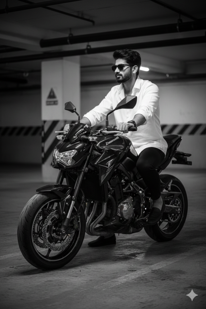 Create a black-and-white monochrome cinematic portrait of a stylish young man ( same as the reference image )sitting on a Kawasaki Z900 motorcycle in sleek black, parked inside an indoor basement parking area. He wears a slightly oversized white button-up shirt, black pants, and sunglasses, gazing calmly to the side with a composed street-style attitude. The bike’s front wheel is turned outward, showing large disc brakes, polished engine reflections, chrome exhaust shine, and the Z900 Continental tank logos. Use hard contrast lighting to create deep dramatic shadows and crisp metallic highlights. Background features industrial parking details-wall pipes, black stripe patterns, and textured concrete flooring. Capture a premium editorial aesthetic with a shallow 50mm depth of field and a subtle film-noir mood. Generate the face using the uploaded reference image with accurate likeness.