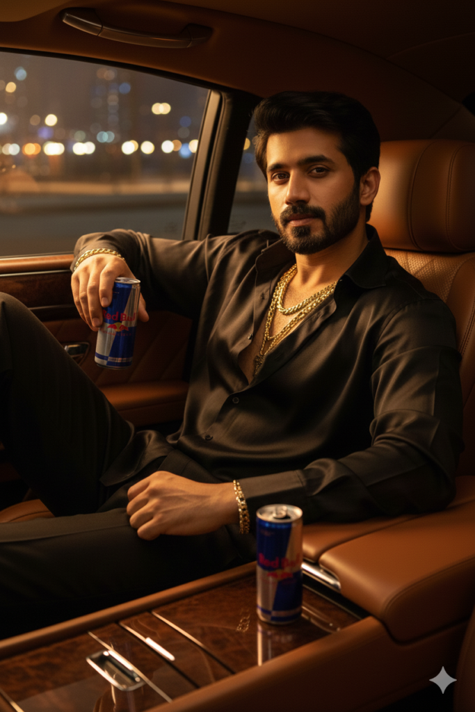 RECLINE IN A PLUSH INTERIOR OR LUXURY CAR, WEARING A SILK SHIRT AND GOLD JEWELRY. RICH, WARM LIGHTING. YOUR EXPRESSION: COMPOSED AND CHARISMATIC. PROPS LIKE redbull , LEATHER, OR VELVET ADD DETAIL.
