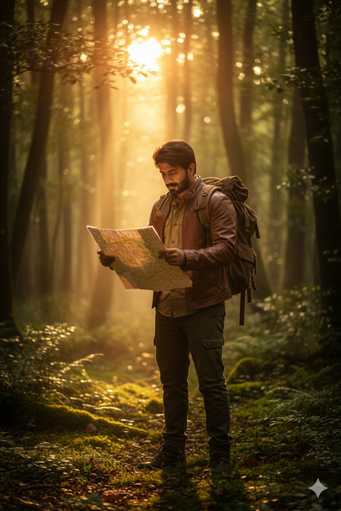 Transformar a imagem enviada em uma foto cinematografica realista de um homem com mochila nas costas e segurando um mapa, em meio a uma paisagem natural vibrante – floresta iluminada pelo por do sol, luz dourada atravessando as árvores, atmosfera de aventura – manter o rosto original da pessoa, mas mudar o corpo e o cenario – adicionar roupas de explorador com tons terrosos, iluminação natural, sombras suaves – lente 50mm com fundo desfocado e vinheta leve – cores vivas, edição profissional estilo filme, qualidade ultra realista, 8k