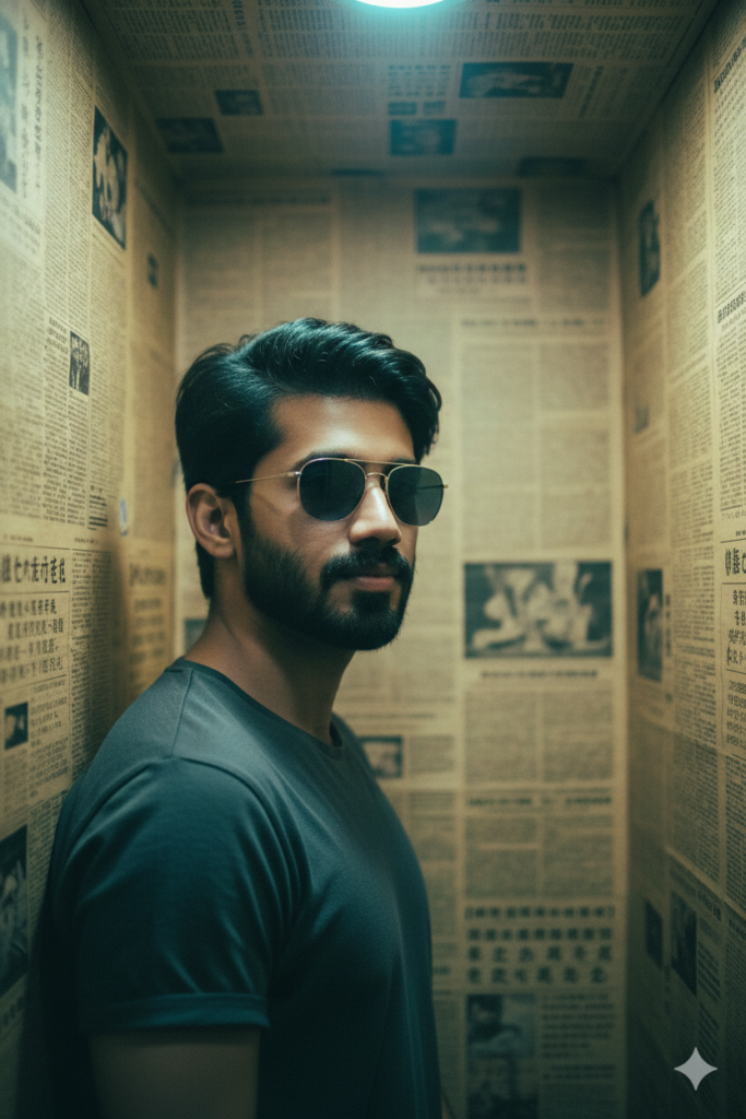 A STYLIZED PORTRAIT OF A PERSON FROM PHOTO STANDING IN A NARROW ROOM LINED WITH AGED NEWSPAPER PAGES ON ALL WALLS, BACKGROUND TONES IN MUTED BEIGE AND YELLOWED PAPER TEXTURES APPROXIMATELY CBBFBA. FRAME THE SUBJECT FROM MID-TORSO UPWARD. POSITIONED IN A THREE-QUARTER PROFILE WHILE LEANING CASUALLY AGAINST THE WALL, HEAD SLIGHTLY TURNED TOWARD THE CAMERA. MAINTAIN A CALM, CONFIDENT, NEUTRAL FACIAL EXPRESSION. DRESS THE SUBJECT IN A SIMPLE DARK T-SHIRT OR MINIMALIST TOP. PAIRED WITH REFLECTIVE TINTED SUNGLASSES THAT CATCH THE OVERHEAD LIGHT. USE A SINGLE COOL OVERHEAD SPOTLIGHT CREATING A SOFT HALO AND CASTING DRAMATIC DIRECTIONAL SHADOWS DOWN THE FACE AND ACROSS THE WALL, WITH COLOR TEMPERATURE AROUND 4200-4800K. EMPHASIZE A MOODY, LOW-KEY ATMOSPHERE WITH GREEN-TEAL UNDERTONES AND SUBTLE FILM-GRAIN TEXTURE. SIMULATE A 35MM LENS WITH SHALLOW DEPTH OF FIELD, KEEPING THE SUBJECT CRISP WHILE THE TEXTURED NEWSPAPER WALLS GENTLY BLUR INTO THE BACKGROUND. PRESERVE SOFT CONTRAST, SMOOTH GRADIENTS, MATTE SURFACES, AND CINEMATIC FALLOFF. MOOD IS INTIMATE, MODERN, AND SLIGHTLY NOIR WITH AN EDITORIAL EDGE. EDITORIAL. MODERN, HIGH-DETAIL, CINEMATIC COMPOSITION, ULTRA- REALISTIC TEXTURES, PROFESSIONAL FASHION PHOTOGRAPHY STYLE.