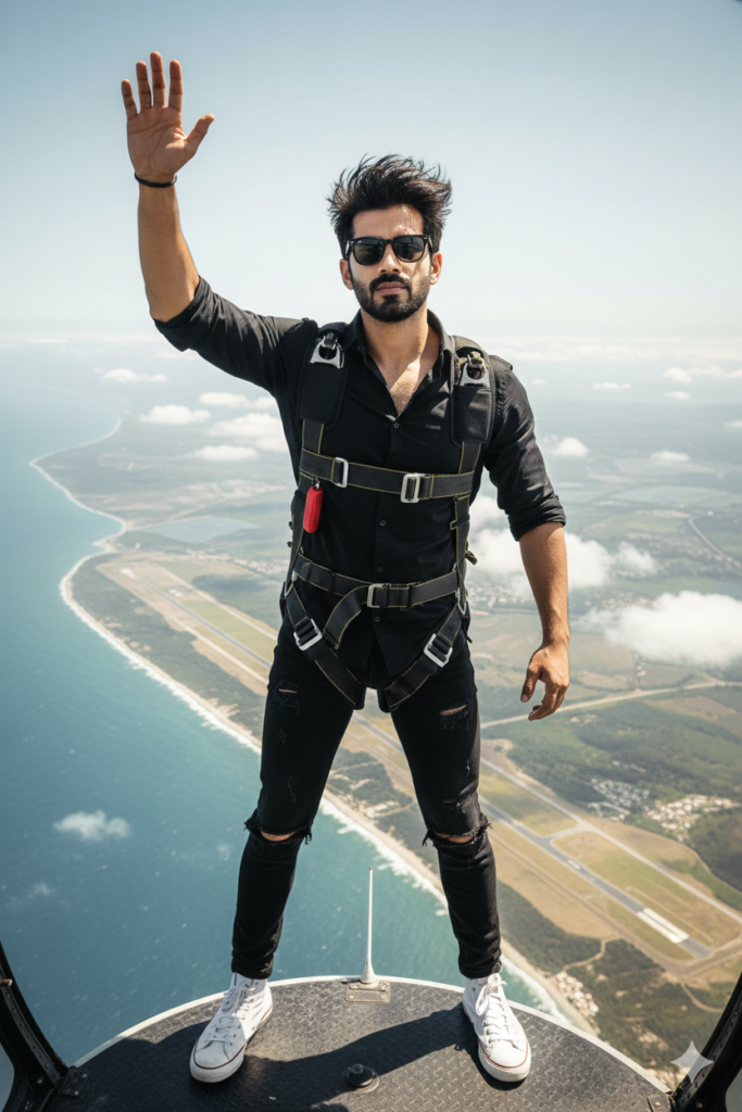 Analyze the style reference image and generate an image of the uploaded subject into the scene described in this prompt. First, deeply analyze the reference to extract every detail with precision: head and shoulder pose, chin angle, eye line and gaze, facial expression, hair styling and edges, crop and framing, composition, camera height and angle, lens character and bokeh, background hue/gradient/texture, lighting direction/ quality/intensity, catchlight shape/position, color grade, and contrast curve. These must be transferred intact, ensuring the result is a true locked-frame replica with only the subject’s identity swapped in. The subject is positioned mid-air, standing on the edge of the helicopter’s frame, with one arm extended upward in a casual wave and the other relaxed downward. Chin is slightly tilted upward, gaze directed forward with a confident and composed demeanor. Expression is neutral yet assertive, lips relaxed and closed. Hair is tousled naturally by wind, defined and sharp against the sky. Crop frames the subject full-body from head to shoes, with parachute harness, straps, and gear clearly visible. Camera angle is slightly below and angled upward, emphasizing altitude, scale, and the daring stance. Lighting is bright natural daylight with strong top illumination, casting clear highlights across the face, hair, and parachute gear. Shadows fall subtly under the chin and body, maintaining detail and structure. Background replicates the reference exactly: sweeping aerial view of coastline, ocean, and airstrip below, with clouds floating across the frame. Horizon fades naturally into a bright sky with blue-gray gradients. Wardrobe must replicate the reference exactly: black skydiving harness over a black shirt and ripped black jeans, paired with clean white high-top sneakers. Harness buckles, straps, and equipment must retain authentic metallic and fabric texture. Color grading emphasizes natural cinematic realism: blues of the ocean and sky are vibrant yet balanced, greens and browns of the land are richly detailed, and clouds remain bright and airy. Blacks of the clothing are deep with preserved texture. Skin tones are clean and natural, subtly warmed by daylight. Technical directives: full-frame DSLR, 24mm wide-angle lens, ISO 200, shutter 1/2000 to freeze motion, daylight white balance. Depth of field ensures both subject and background are crisp, preserving environmental detail. Deliver in 4K photorealism with defined detail in hair strands, skin, fabric, and equipment. Negatives: forbid altering pose, wave gesture, harness gear, or lighting setup. No painterly effects, blur, surreal tones, distortion, or Al artifacts. No text or watermarks