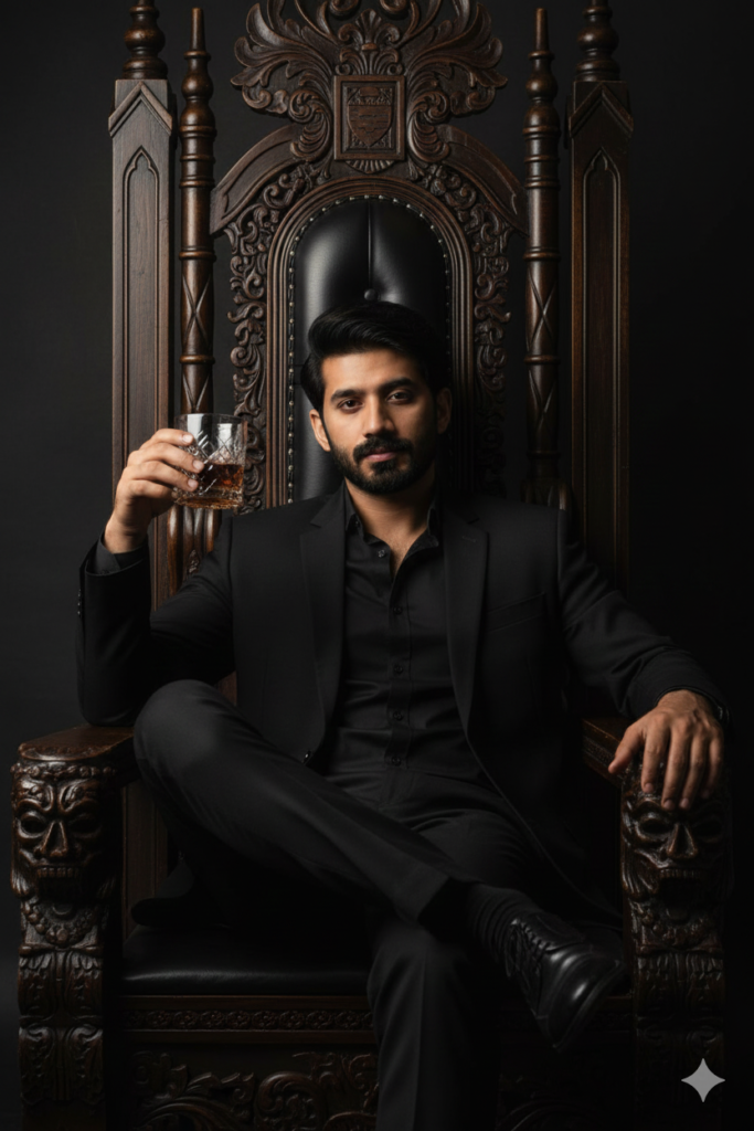 The subject sits in a dark, ornate throne, body leaning back with one leg crossed forward in a confident, relaxed posture. They wear a fitted black suit with a black shirt underneath, open collar for a sharp yet casual dominance. One arm rests on the throne’s carved armrest while the other raises a glass of whiskey, held casually at shoulder level, glinting with amber light. Their expression is shadowed and intense, face partially obscured by dramatic low-key lighting, giving an aura of power and mystery. The throne is detailed and gothic, with tall carved spires and an imposing presence.