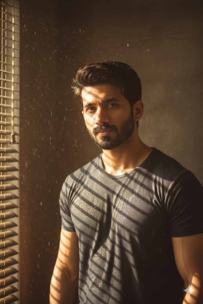A CINEMATIC PORTRAIT OF A MAN STANDING AGAINST A TEXTURED WALL, WITH GOLDEN SUNLIGHT CASTING DRAMATIC SHADOWS THROUGH WINDOW BLINDS ACROSS HIS FACE AND BODY. IT’S LIGHTLY RAINING, AND THE SOFT RAINDROPS ARE BARELY VISIBLE AS THEY FALL THROUGH THE GOLDEN LIGHT. THE LIGHTING ADDS A WARM, MOODY TONE WHILE THE SHADOWS CREATE STYLISH LINES OVER HIS FACE, HIGHLIGHTING HIS EXPRESSION. THE BACKGROUND REMAINS SOFTLY BLURRED, EMPHASIZING THE SUBJECT’S FORM AND TEXTURE.
