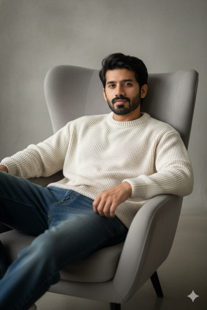Hyper-realistic 8K editorial frame. Studio setting with soft ambient light. Male model in oversized sweater and loose jeans. Pose: lying back in an armchair, torso angled, one leg over the side, arms resting loosely; head tilted slightly toward camera. Expression: subtle smirk or relaxed neutral expression. Vibe: effortless, stylish, masculine. Lighting: soft key light from the side, gradient shadows. Shot on 35mm lens. –serf 3146691152