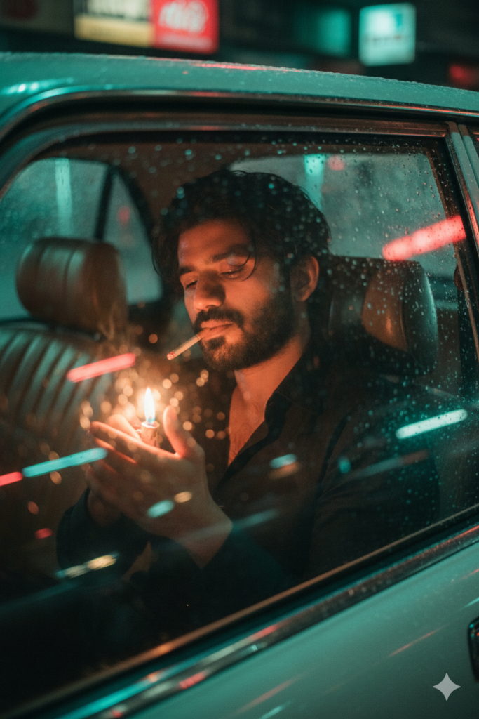 Wong Kar-wai’s cinematic-style realistic portrait But with semi long messy grown hairs on my head Using an uploaded photo as a reference, highlighting the jawline and neck to create a statuesque look, while maintaining the shape and identity of the face. Pose: Sitting with his head against the window lighting a cigrette with lighter, the streetlight’s light shining through. Setting: Inside an old taxi with faded leather seats, the glass fogged up by rain, and the streetlight’s light refracting into blurred streaks. Camera angle: Shot from outside the window, with overlapping reflections on the face. Lighting: Red-green neon lights passing by, causing the face to change color with the light. Clothing: Black button-down shirt, slightly open, shaved head, head appearing damp. Image tone: Red-green contrast, thick film grain, pronounced motion blur, and a hazy glow around the vehicle’s headlights. and flame light on his face .Mood: Loneliness, solitude, a sense of a big city with no answering voice.