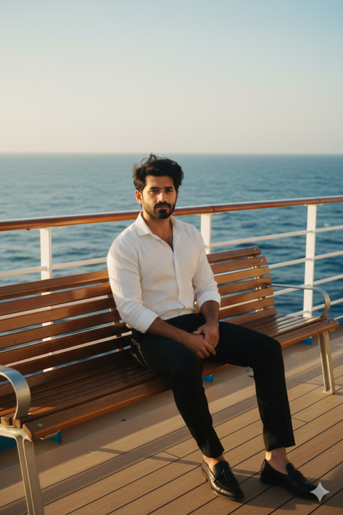 A realistic fashion photo of me sitting on a wooden bench on a cruise ship deck at golden hour. He wears a white striped shirt and black pants, facing the deep blue ocean. Warm sunlight, gentle breeze, white railings, cinematic romantic vibe, subtle film grain.